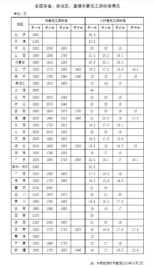 从小时最低工资标准来看:北京小时最低工资标准为26.4元,为全国最高。